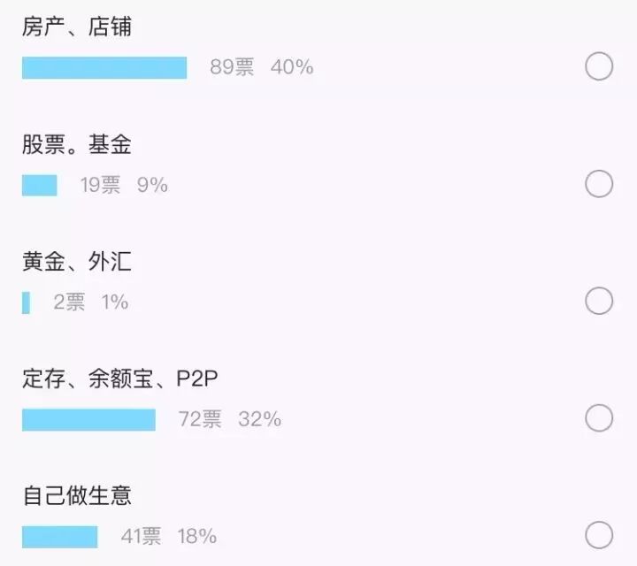 外地有网友发起了一个投票。结果显示,多余的拆迁款用来投资不动产人数和定存理财的人数相当,而进行高风险的股票投资者相对较少。