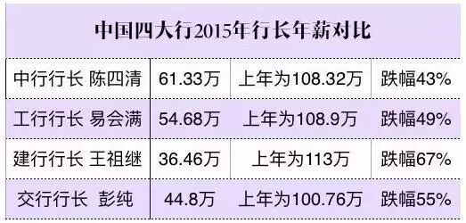 国有大行高管薪酬的腰斩,以工商银行为例,董事长姜建清和行长易会满2015年的税前合计总薪酬都是54.68万元,其中已支付的税前薪酬为44.8万元,与2014年的113.9万元和108.9万元相比,缩水近一半。