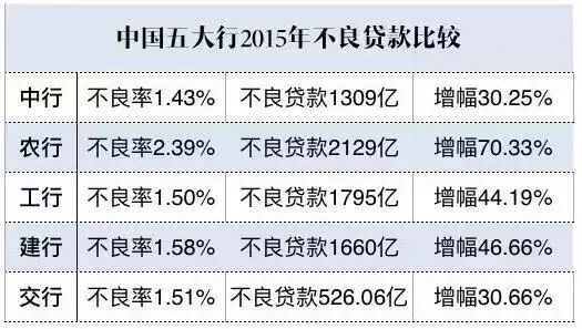 10年最高。中国银行业承担着12744亿不良贷款。农行不良率远超其余四大行突破2%“生死线”高达2.39%。不良贷款傲视群雄,相当建行交行不良贷款总和。