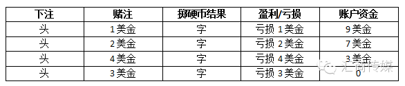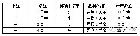 假设你的赌注是10美金,你最开始的赌注是1美金,并下注在“头”上面。第一次你赢了,获得了1美金,账户变成11美金。如果这一次你赢,那下一场的赌注不变,还是1美金。如果这一次你输,那么下一场增加一倍赌注。因此,由于第二场你输,所以第三场你的赌注变成2美金。不幸的是,你又输了。所以第四场赌注再翻倍,变成4美金。运气来了,你总算又赢了!于是你的账户现在有12美金。这个例子证明,你只需要一次成功的交易,就能赢回之前所有的亏损。