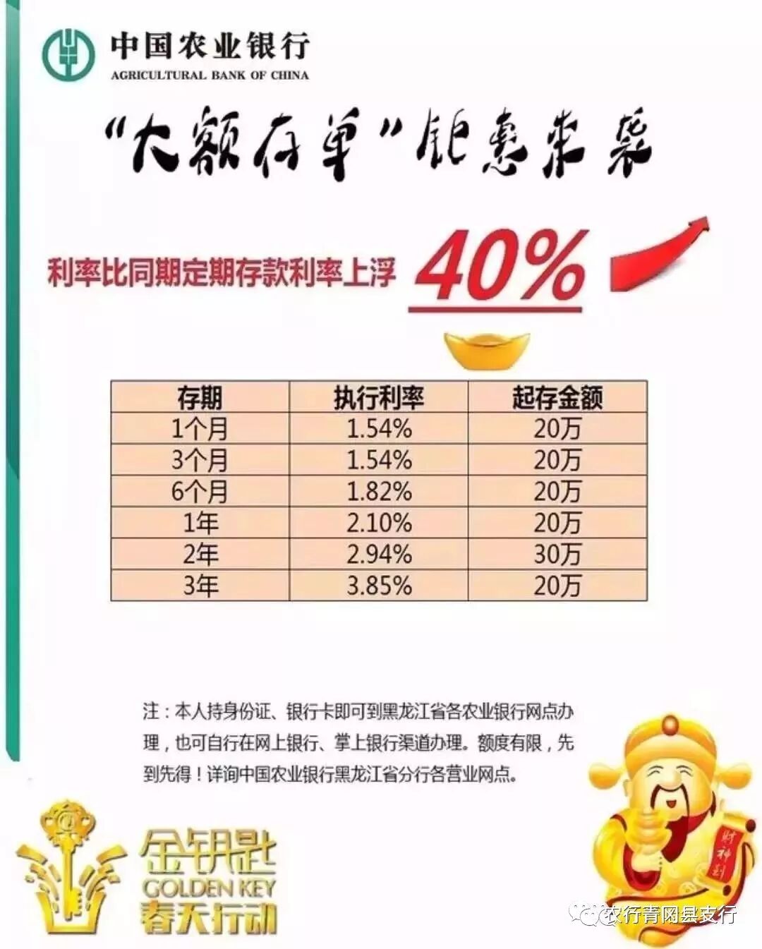 农业银行三年期、五年期存款利率较基准利率