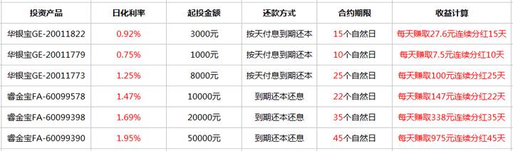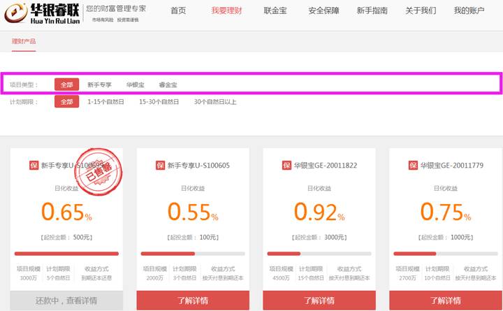 “华银睿联”推出华银宝短期理财、睿金宝周期理财,定存理财、联金宝活期理财,旗下十几款理财项目!