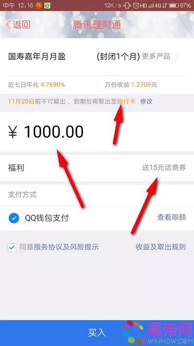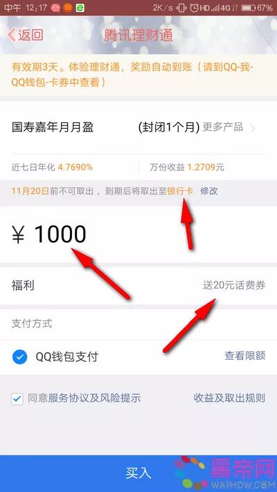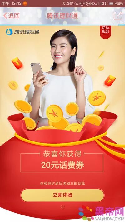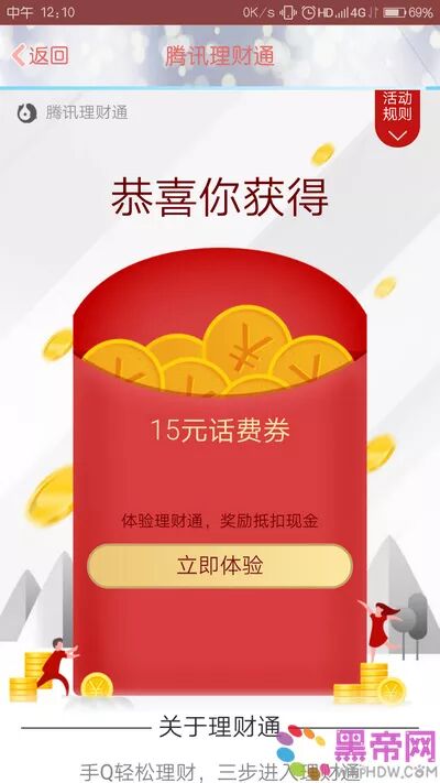 活动介绍:活动期间参与QQ理财通送15元话费券+20元话费券活动,通过使用QQ进入活动页面参与均可获得一份15元话费券+20元话费券奖励,所得奖励按照提示需要分别买入1000元定期一月理财才可进行提现至银行卡,小编也是考虑到有部分也喜欢做定期的,所以就将这个定期的红包发出来了。黑帝网的网友快去参加试试运气吧!