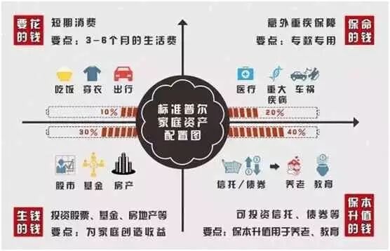 “标准普尔家庭资产象限图”把家庭资产分成四个账户,这四个账户作用不同,所以资金的投资渠道也各不相同。只有同时拥有这四个账户,并且按照相对固定合理的比例进行分配才能保证家庭资产长期、持续、稳健的增长。