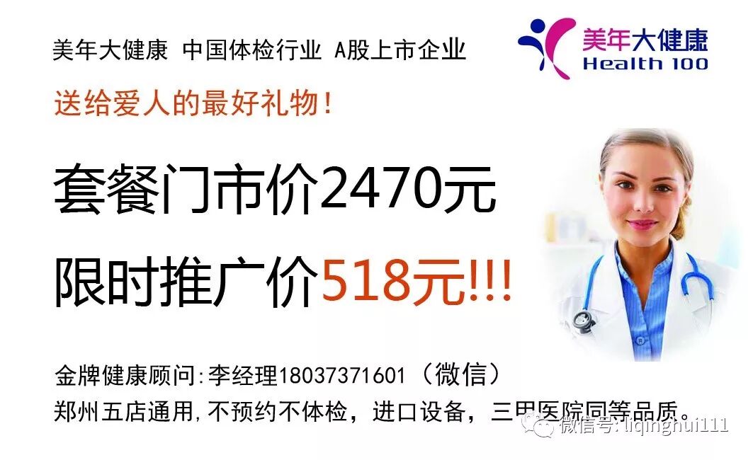 特惠体检套餐福卡518元,仅限郑州地区,“不预约,不体检”。预约18037371601(微信)