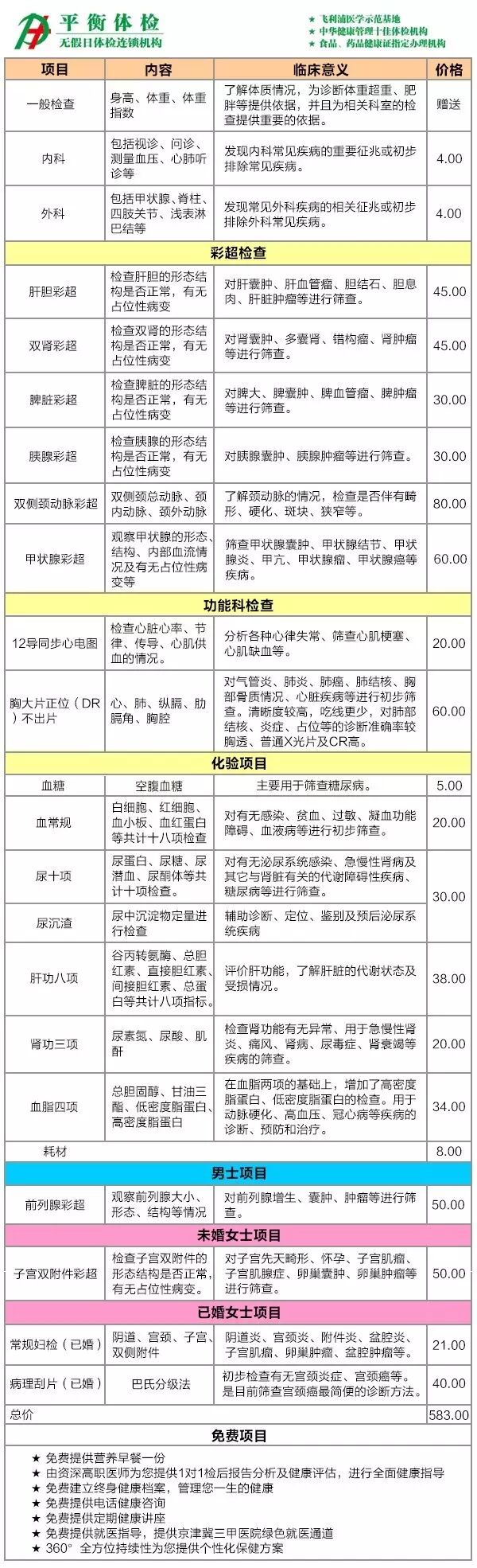平衡体检根据十几年的经验累积,制定一对一,一站式,人性化服务模式。根据客户工作特性,性别,年龄等差异化需求,专门定制特色私人套餐服务,分为男士,女士,老年,家庭,企业等专业性套餐。