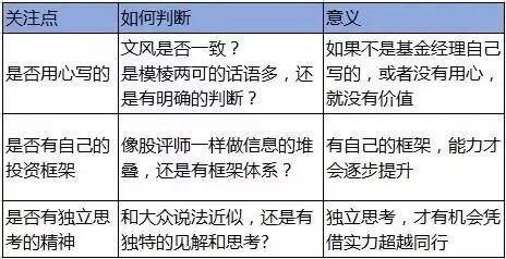 还有就是看基金公司的季报、年报的讨论部分,看基金经理是否有自己的投资框架和独立思考的精神。
