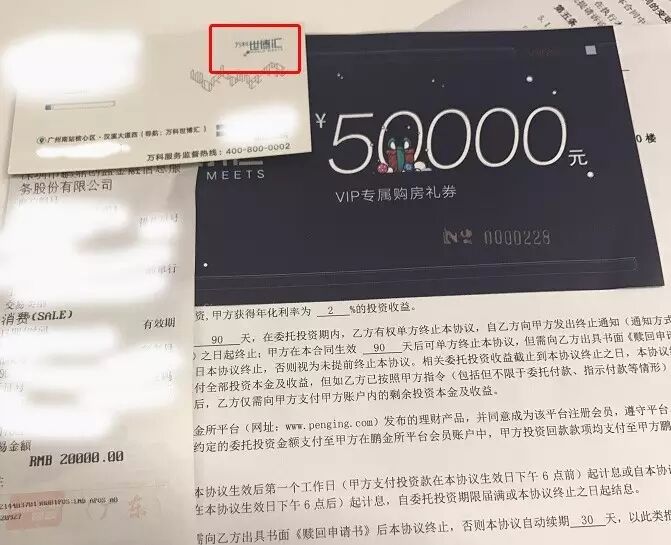 这是万科世博汇所有筹客都会有的一份资料,上面钉着5万元优惠券,2万元消费单,鹏金所委托投资协议及经纪人名片。