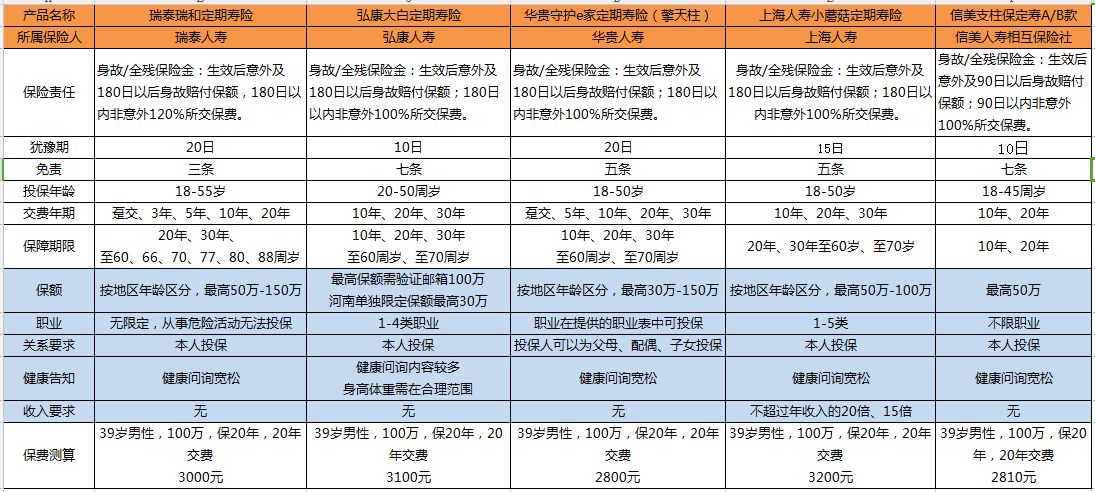 小核保员选取了目前网销渠道热销的定期寿险中的五款,重点关注保额限定、职业要求、健康告知、收入要求等。