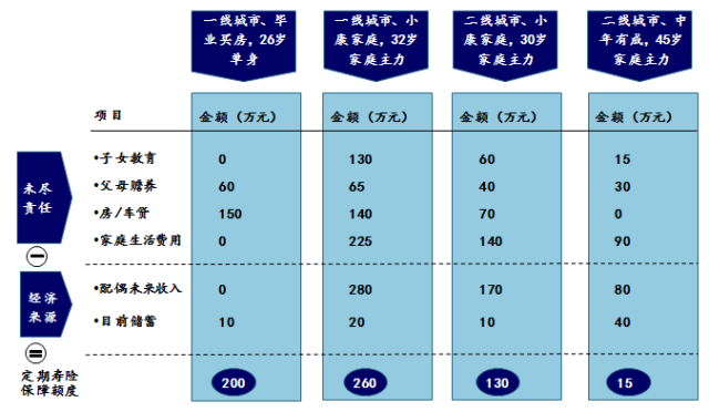 简言之,就是一个人未尽的经济责任越大(房贷越多、子女教育支出越多等等),而又不是土豪,一个亿的小目标还没实现,那么ta就需要比较高额度的定期寿险。