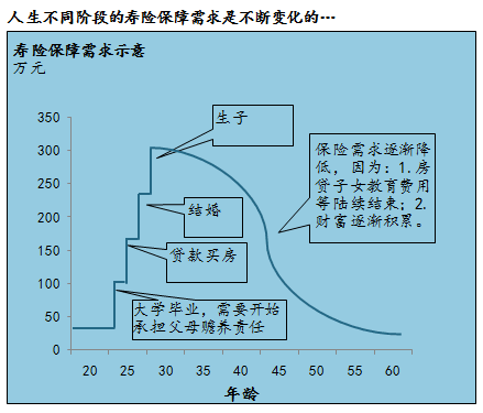 特别是,30岁左右,由于有房贷等贷款,而且子女教育和父母赡养等未尽责任压肩。是对定期寿险需求最高的时候: