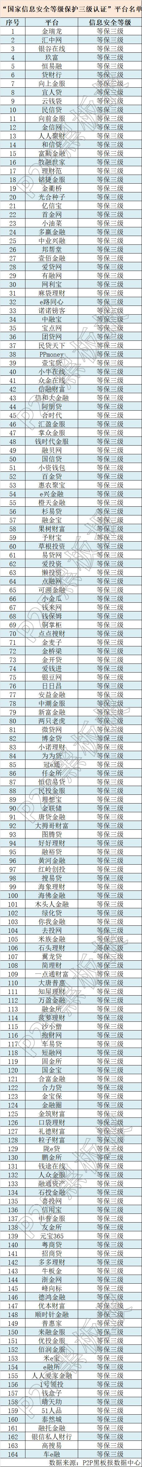 据P2P黑板报不完全统计数据显示,截至2018年1月底,网贷行业正常运营平台数量降至1700余家,其中通过信息系统安全等保三级备案认证的平台为164家,仅占在运营平台数量的9%。名单如下: