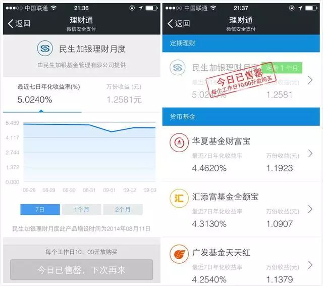 “民生加银理财月度”由民生加银基金公司提供,每个工作日10点开放购买。用户买入后,该笔资金就进入封闭期,1个月内不可取出。到期后,用户可以选择自动买入下一期或取出至银行卡。