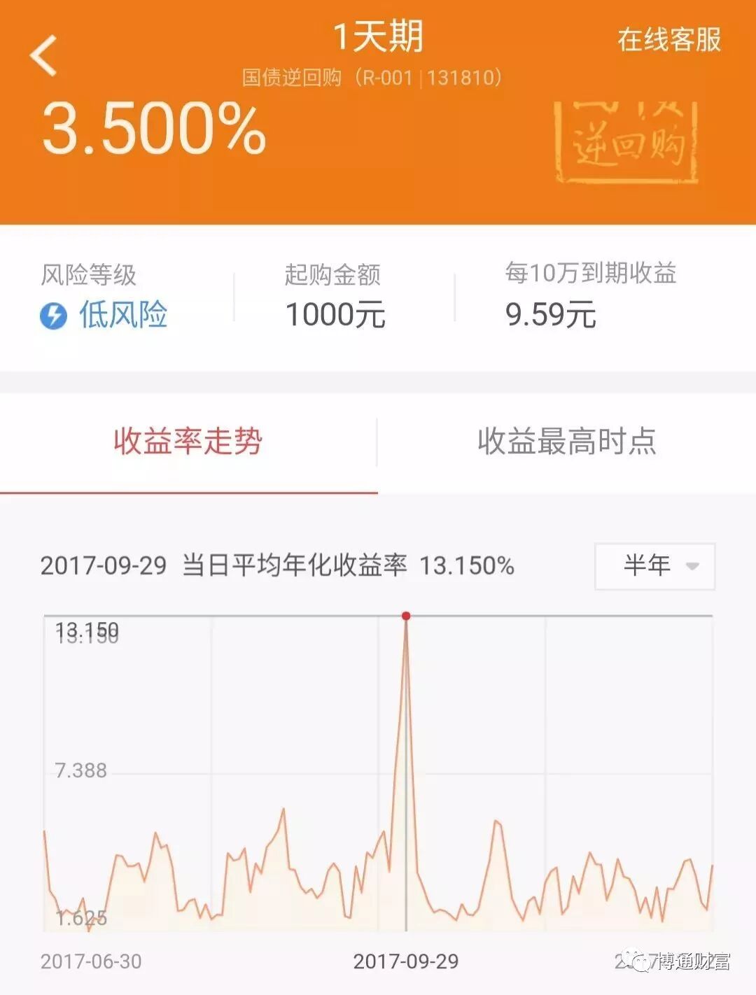 第二,做逆回购。这个比前述的钱生钱方法稍微复杂点,但是只要搞懂了,就很简单。一般来说,春节前逆回购会年化收益率会打出高点,单日年化百分之十几以上。