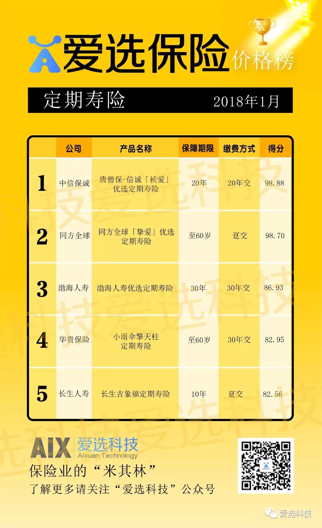 随着时间的推移,越来越多保险公司,愿意通过各种渠道,将自己即将上市的产品提供给我们,让我们进行评测,我们十分感谢,倍感珍惜,我们也将严格保密。谢谢大家。下面是2018年1月份的定期寿险榜单,这是一张最容易制作的价格榜单,因为保险利益简单,保费比较直接,唯一的复杂一点的维度也就是吸烟、非吸烟带来的优选费率,不过随着收到产品的增加,下个月开始,榜单位次会发生变化,受到新入库产品的影响,所有产品分数都可能发生相对变化。综合榜单随着保险公司年度、季度各项财务数据、服务、理赔数据、其他相关数据的变化,也将发生变化。