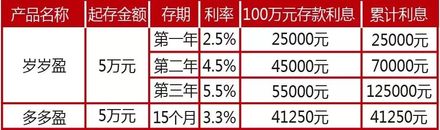 本期我们推出“岁岁盈”和“多多盈”两款产品供您选择,“岁岁盈”产品是存期三年的存款产品,存期满一年,第一年利率按2.5%计息;满二年,第二年利率按4.5%计息;满三年,第三年利率按5.5%计息,靠档计息,存期越长获利越高。因此,您未到期存款,仍有更多利息保障。