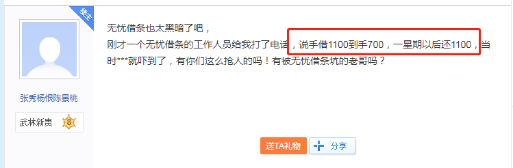 借款时间仅有一周,700元,借7天后,要还1000元;1000元,借7天,要还1500元。借条的逾期罚金极高,拖欠一天,就要罚两三百元。某用户爆如今已借了7个借条,到手7700多,应还1.3万,加上逾期罚金,如今已滚到了5.2万。
