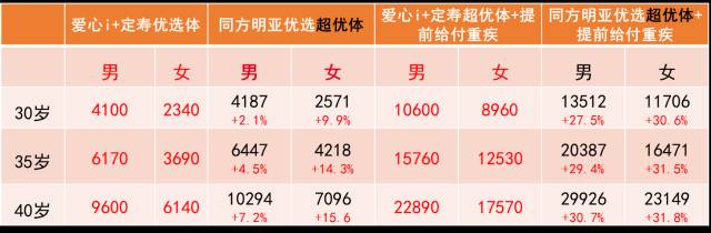 与明亚向同方定制的优选定寿比,男性价格便宜5%左右,女性便宜10%左右;如果考虑附加提前给付重疾,价格差距进一步拉大,差距在30%左右,该附加重疾有轻症责任,但是考虑30%价格差距,还是偏贵的。