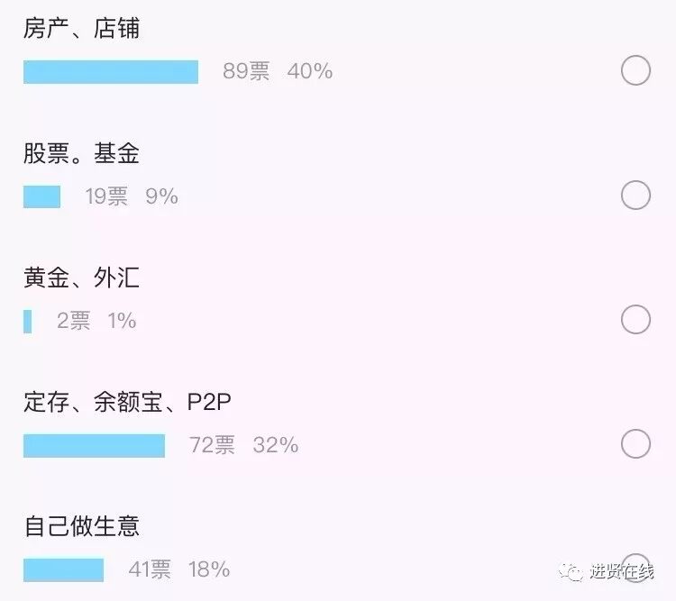 外地有网友发起了一个投票。结果显示,多余的拆迁款用来投资不动产人数和定存理财的人数相当,而进行高风险的股票投资者相对较少。