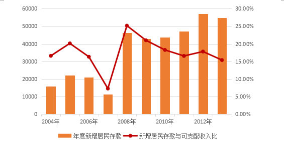 如图所示,虽然自2010年来储蓄率开始下降,但我们发现,即便下降后的储蓄率也高达38.46%,不仅高于本世纪初的31.09%,更是高于市场化改革之初(1992年)的29.55%。高企的储蓄率反映了居民抑制消费、乐于银行存款的现况。数据显示,虽然新增银行存款占居民可支配收入的比例自2008年之后下降,但其绝对额增长的趋势并没有改变。