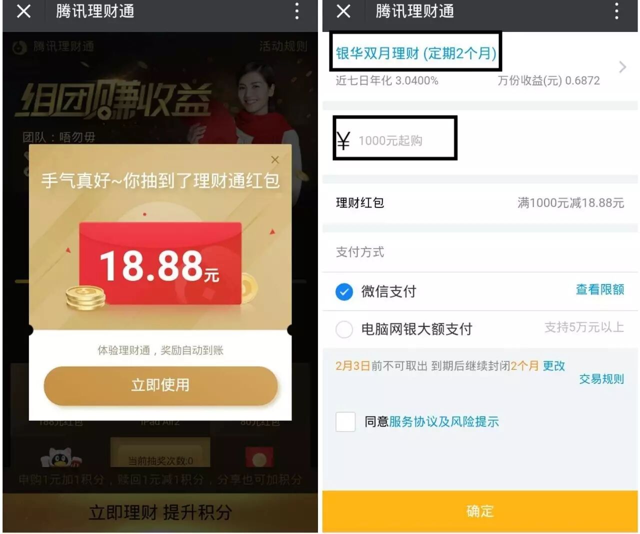 红包是随机领取的,小编领到18.88元,1000元起购定期2个月,抽到不同的红包买入要求也会不一样,反正看清楚了再撸