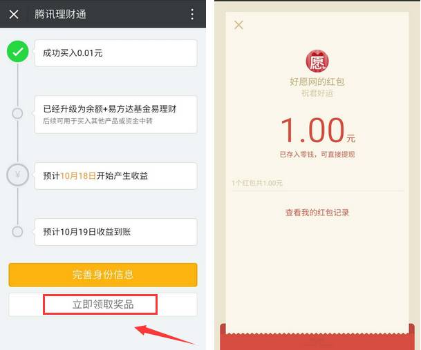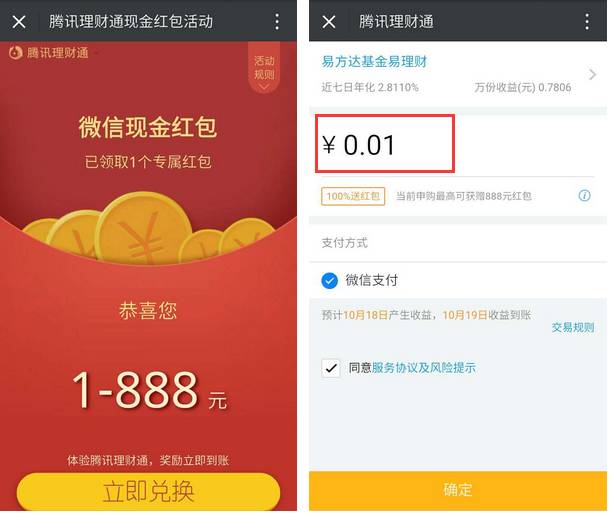 理财通新用户、首次参加好愿网红包的用户,支付0.01元领1-888元微信现金红包