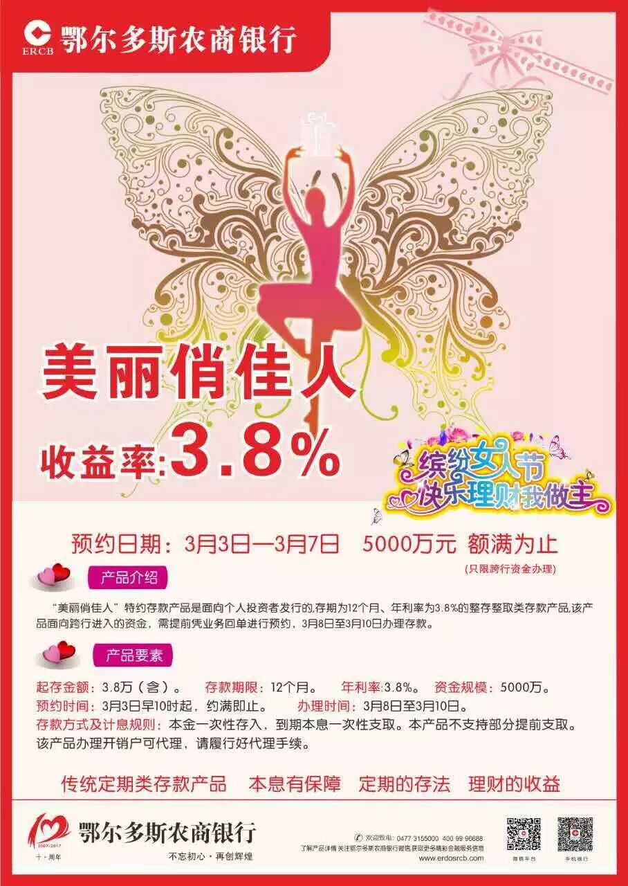 为了感谢广大客户多年来对鄂尔多斯农村商业银行的大力支持,值此三八妇女节来临之际,我行特开展“美丽俏佳人”三八节特约存款活动。
