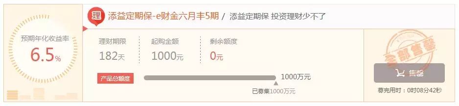产品一上线,受到理财用户很大的追捧,以六月丰5期为例,1000万元的额度8分多钟就被用户抢完: